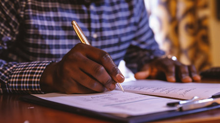 Focused individual jotting down plans and notes in a diary, with a blurred background hinting at a cozy environment