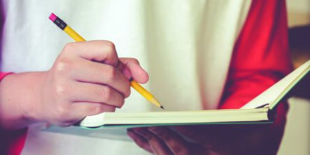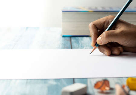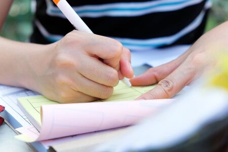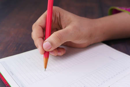 Close up of hand high school or university student in casual holding pencil writing on paper notebook, Teenager student hand writing lecture note book at school campus, College education