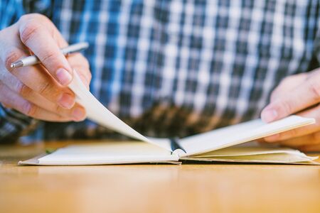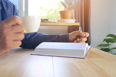 Women hands close up writing with pen in notebook, taking notes from textbook, studying withacademic book in cafe with coffee cup.