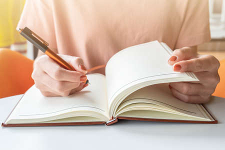 Close-up of a woman's hands holding a notebook and a pen, and making a note. journalism.