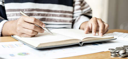 Close up hand a man hold pencil for write on the note book and newspaper glasses on wood table
