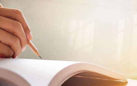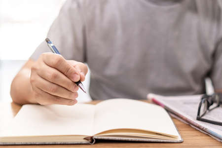 Close up of hand high school or university student in casual holding pencil writing on paper notebook, Teenager student hand writing lecture note book at school campus, College education