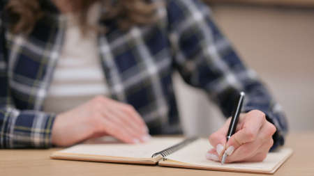 Female hands writing with pen in notebook, taking notes, studying with academic textbook, close up.
