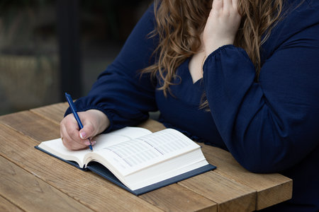 Close-up of woman writing something in notebook in cafe. Concept. Woman writes down something personal or plans day in cozy cafe.