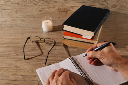 Top view of closeup male hand written notebook on the table of gradient blue wooden texture background.