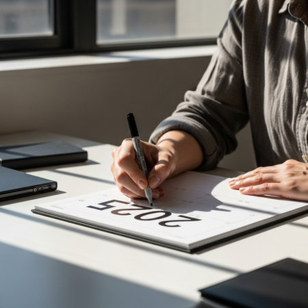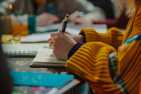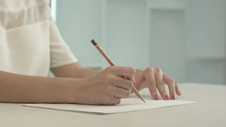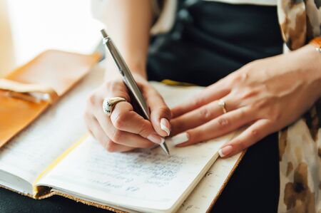 Woman sitting at office desk opens and writing notes in diary with pen, concentrated person writing down ideas and tasks, close up shot.