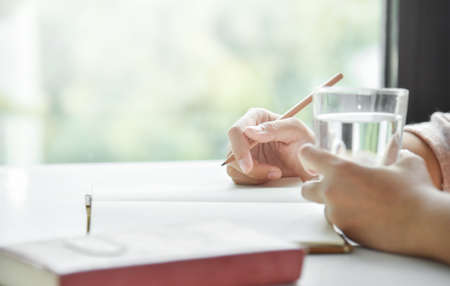Happy Asian woman writing on notebook or diary with glass of water in bedroom. Copy space.
