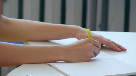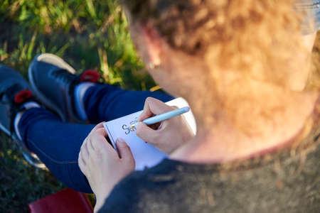 Top view of person taking notes in a blank notebook with a black pen outside on a summer day – Young woman writing on a white page of a scrapbook in nature