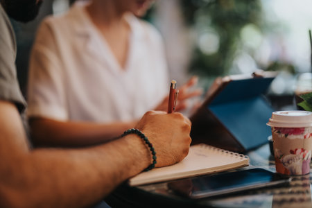 right hand holding pen writing in notebook beside tablet on wooden table. illustration of a businessman at work