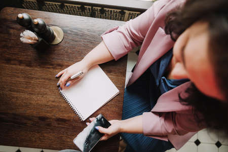 Young business woman sitting at table in caffee terrace and taking notes in notebook.On table is smartphone and paper documents. Student learning online or blogger concept.