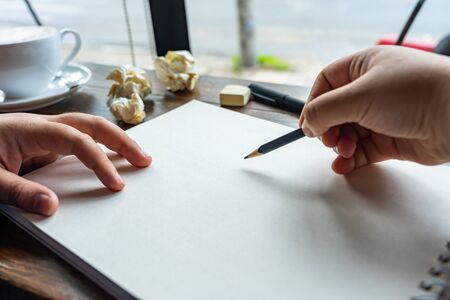 Human hand drawing on sketchbook by pencil at coffeeshop