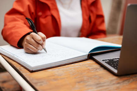 Close up of business woman writing notes at a cafe on a notebook - Detail of hand writing, computer, coffee and phone also on the table - Business on the go concept in London