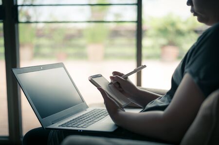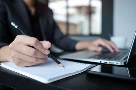 Woman hand works in a laptop computer and is writing on notepad with a pen in the office.On her desk there is a cell phone.