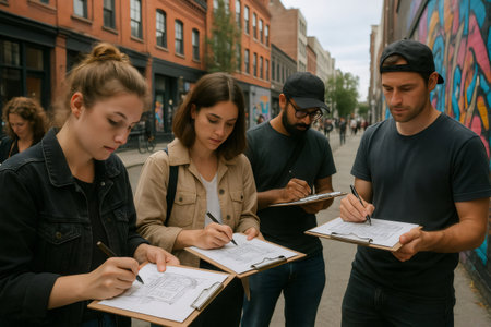 Group of young urban sketchers drawing city buildings on clipboards, standing in a street with brick facades and graffiti art