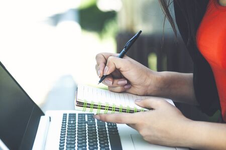 Cropped shot of female hand writing on blank notebook while working with laptop on office desk