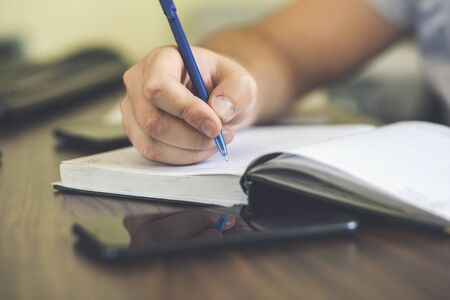 Close up of young man in casual cloth hands writing down on the notepad, notebook using ballpoint pen on the table.