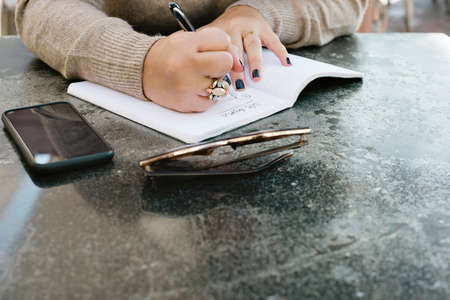 Close up of woman's hands writing, notepad on wooden table with books and plant.