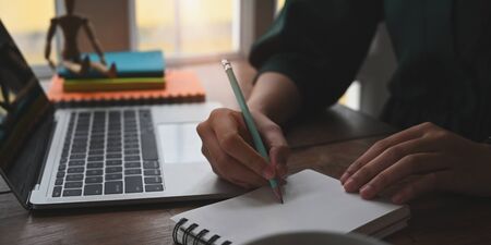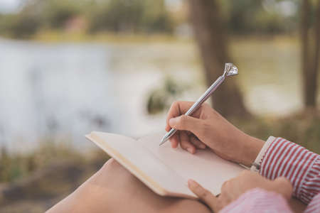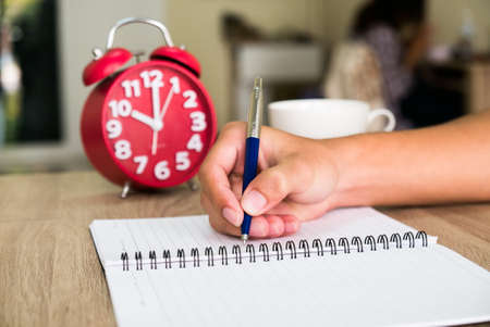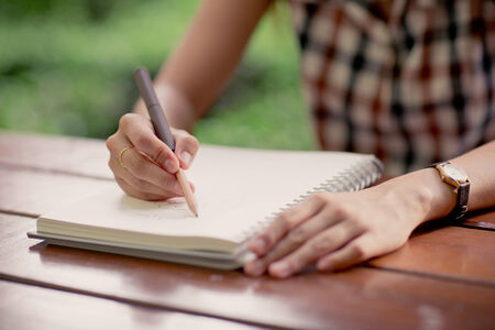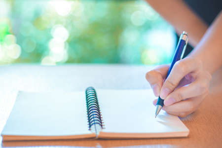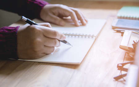 Woman right hand writing on notebook at home area in morning with sun light and vintage tone.