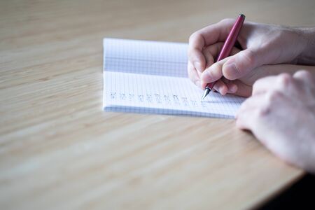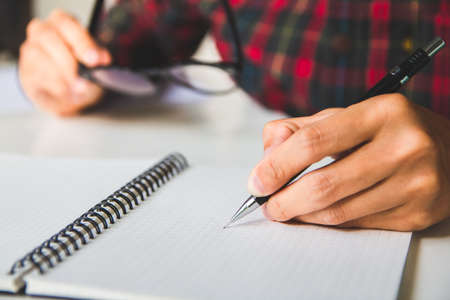 Closeup of male right hand writing text on blank notebook on wooden desk in office.