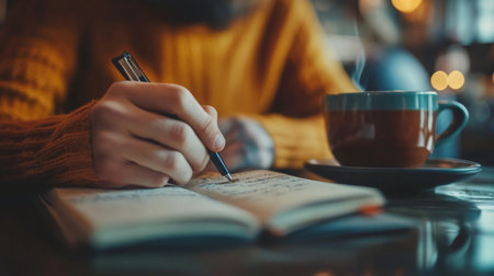 A person writes notes in a notebook while enjoying a cup of coffee in a cozy cafe