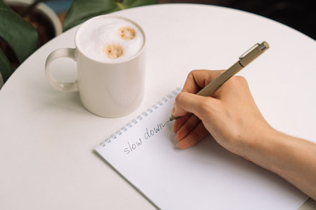 Handwriting slow down in notebook next to a mug of cappuccino on a round table.