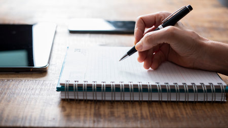 Close-up of photographer sitting at the table among wireless gadgets and writing a list of new orders from his clients in notepad