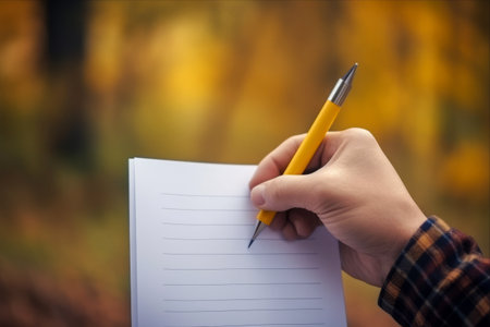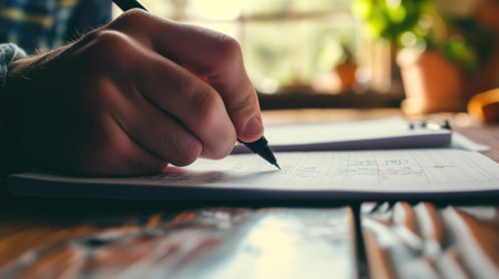 Focused individual jotting down plans and notes in a diary, with a blurred background hinting at a cozy environment