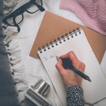 A top view closeup of hand writing To do on the notebook, eyeglasses, and camera on the bed- concept planning a travel