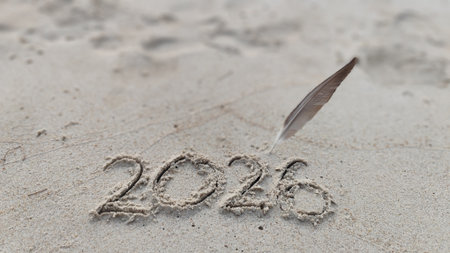 Year 2026 written in beach sand with feather accent. New year concept symbolizing fresh beginnings, hope, future plans, and calm seaside inspiration.