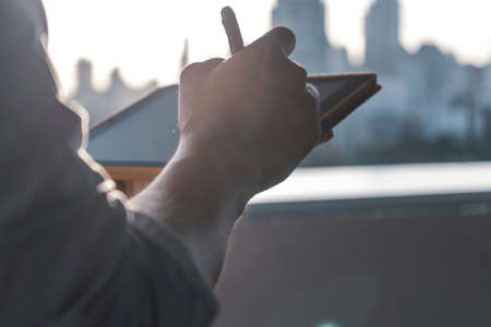 Closeup shot of notebook and pen in hands. Inside the car. Ready to write. Making a plan of trip