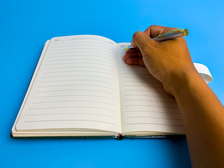 Close-up of a female hand holding a pencil and writing in a notebook on a blurred background.