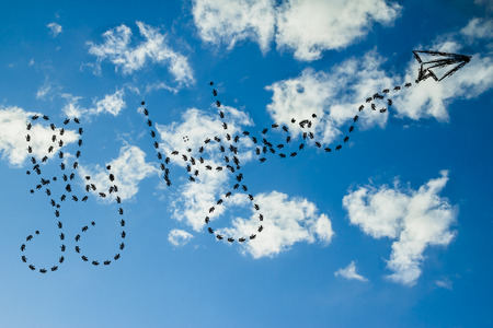 the words Fly Higher made by the trail of a paper airplane: concept of effort, success and achievements