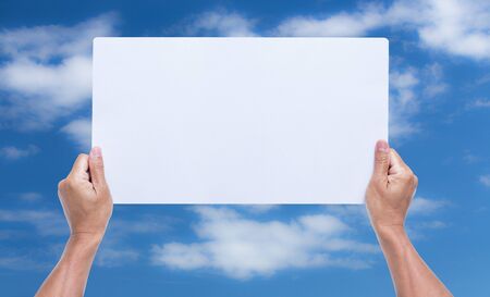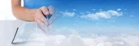 Composite image of clouds in the blue sky and hands praying over holy bible. christianity and religion concept