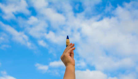 A Child's Hand With A Blue Pencil Painting The Sky. Creative Photography With Copy Space