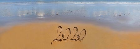 2020 drawn on the sand beach, new year concept. bye 2020 text is written by hand on the beach sand