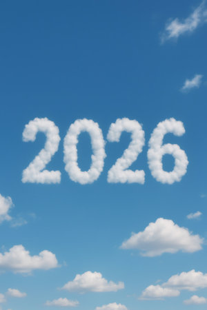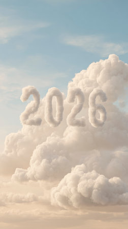 New year 2026 concept travel on the background below cloudscape. Drawing by passenger airplane vapor contrail in sky.