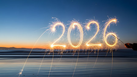 Sparkler writing 2026 on beach at sunset with ocean waves and hand holding sparkler Clear details...