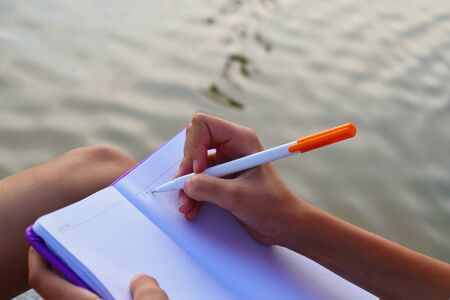 The girl keeps a secret diary. Female hand writes a letter on the lake. Writing our thoughts in a notebook.