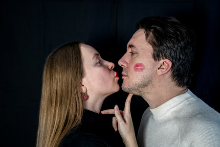 couple on dark background, woman in black. Man in white, partners look at each other. Lipstick print on male cheek. Family, yin yang contrast, opposites attract. Girlfriend kissing