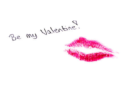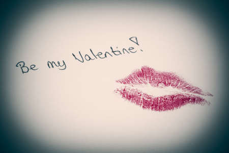 Be my valentine written on paper with a kiss of lipstick
