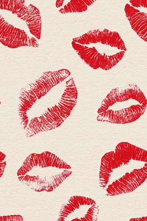 Red lipstick kiss marks covering a cream textured paper surface, creating a playful pattern. Red lipstick kiss marks seamless pattern on textured paper