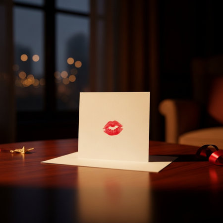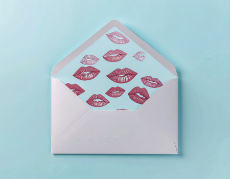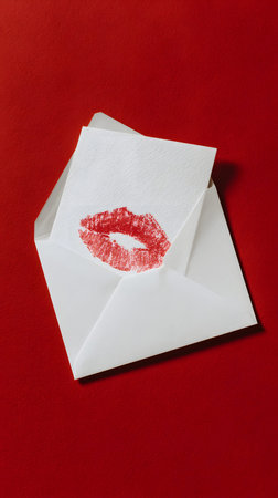 A red lip print on white note card in open envelope on red background expressing romantic affection