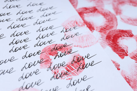 imprint of womans lips in red lipstick with inscription love you on wrapped paper, many kisses