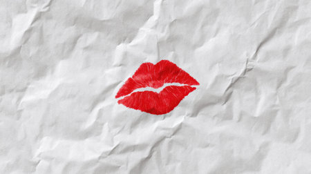 A striking red lip print stands out against a textured crumpled paper background, perfect for themes of romance, beauty, and artistic expression in creative projects.