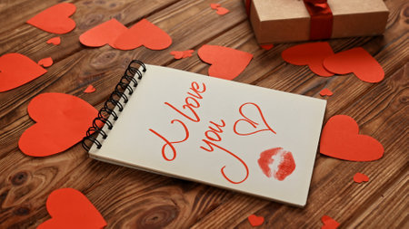 Valentines day concept. Close up of wooden table with scattered red paper hearts and gift box on the surface, notebook with text I love you and kiss mark laying on the desk.
