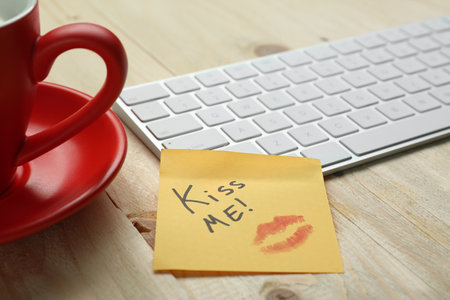 Sticky note with phrase Kiss Me, lipstick mark, cup of coffee and keyboard on wooden table, closeup