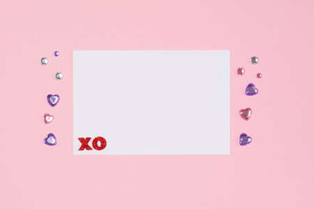 Paper note with valentine pink and purple hearts on pink background. Romantic love letter for Valentines day
