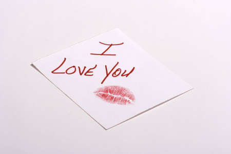A note paper with the message of I love you and a lipstick kiss at the bottom.