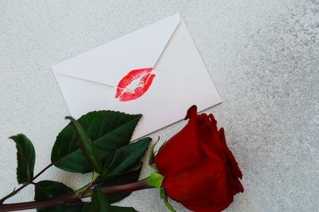 A letter with a kiss print rests on a light surface next to a red rose. The scene captures the moment of a romantic gesture. The rose has fresh green leaves creating a nice contrast.