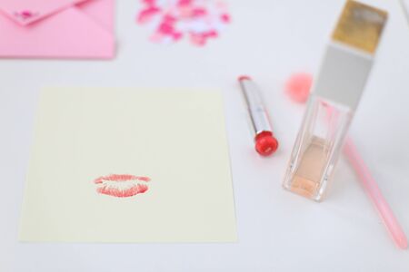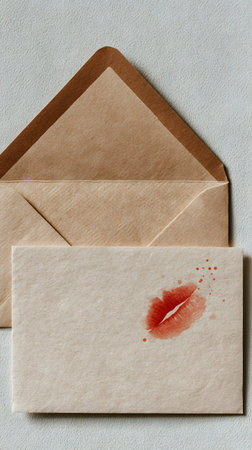 A kiss mark on kraft envelope and card romantic love note with lipstick stain and paper texture